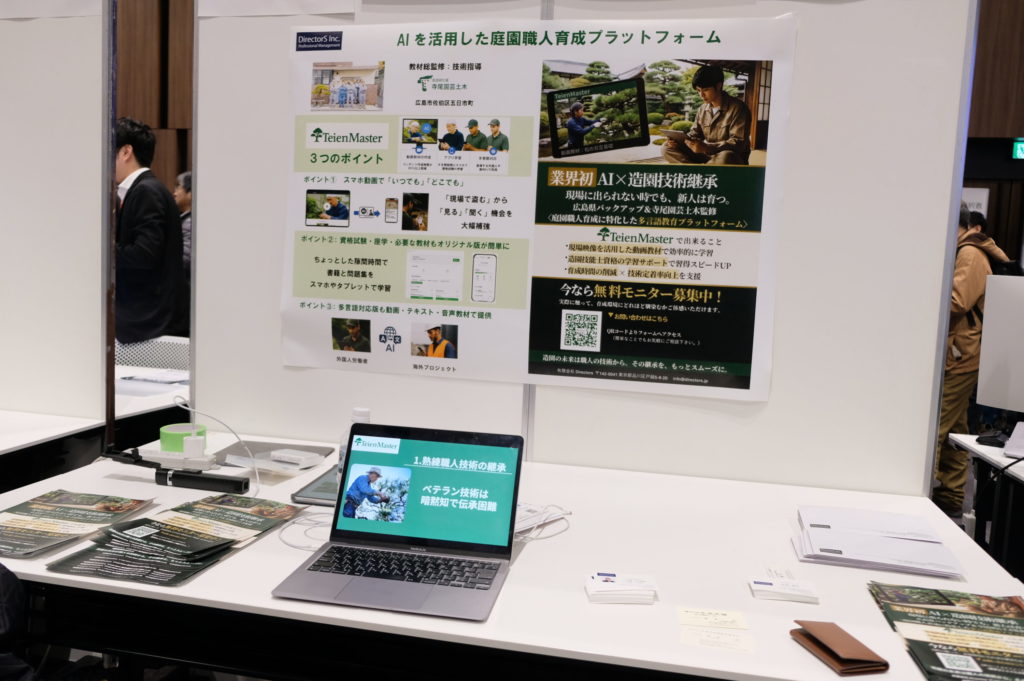 造園業界における深刻な若手人材不足や、職人の「暗黙知」による技術継承の難しさを解消するため、当社はAI技術を活用した教育プラットフォーム「Teien Master(庭園マスター)」の開発に取り組んでいます。