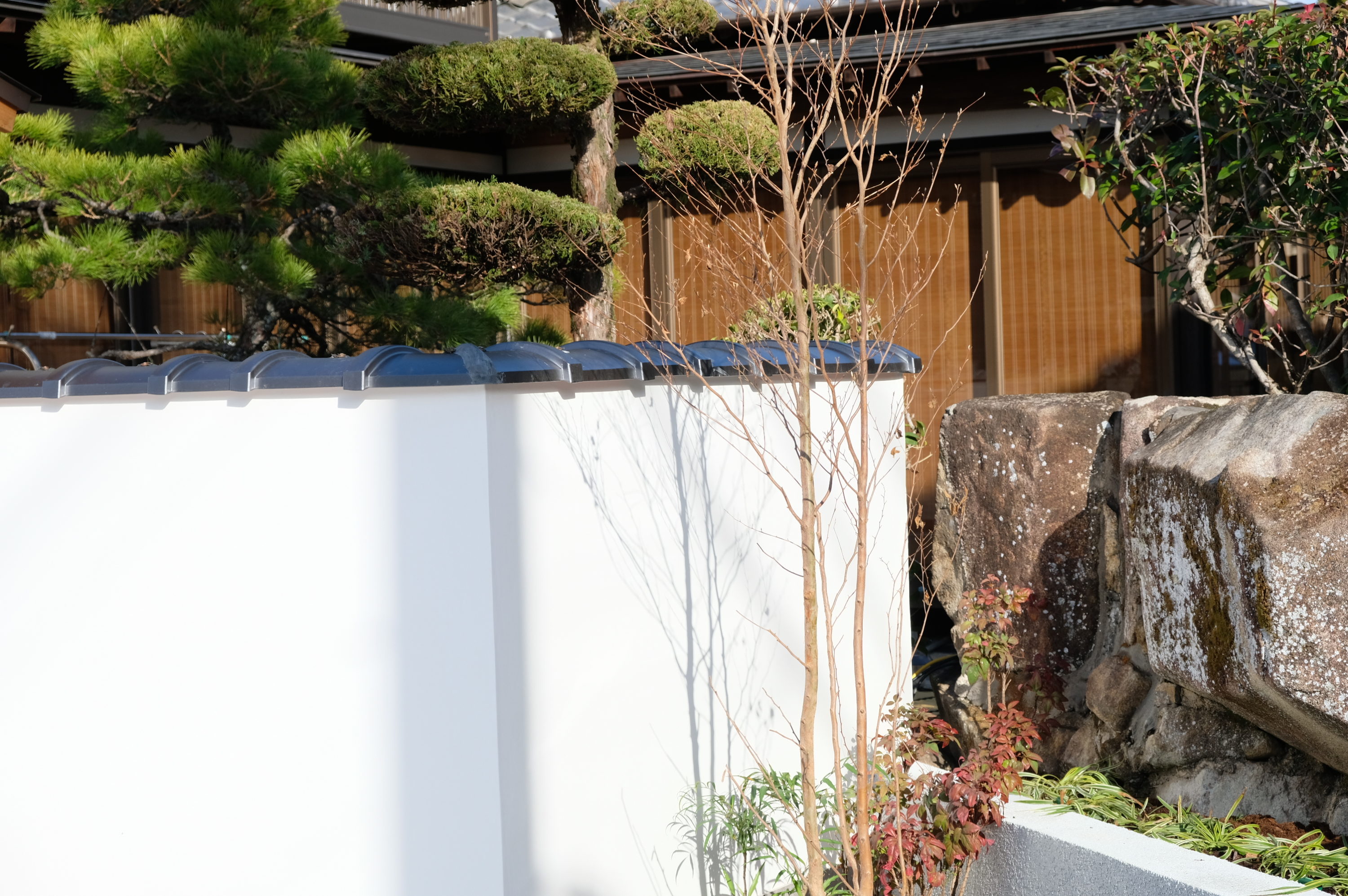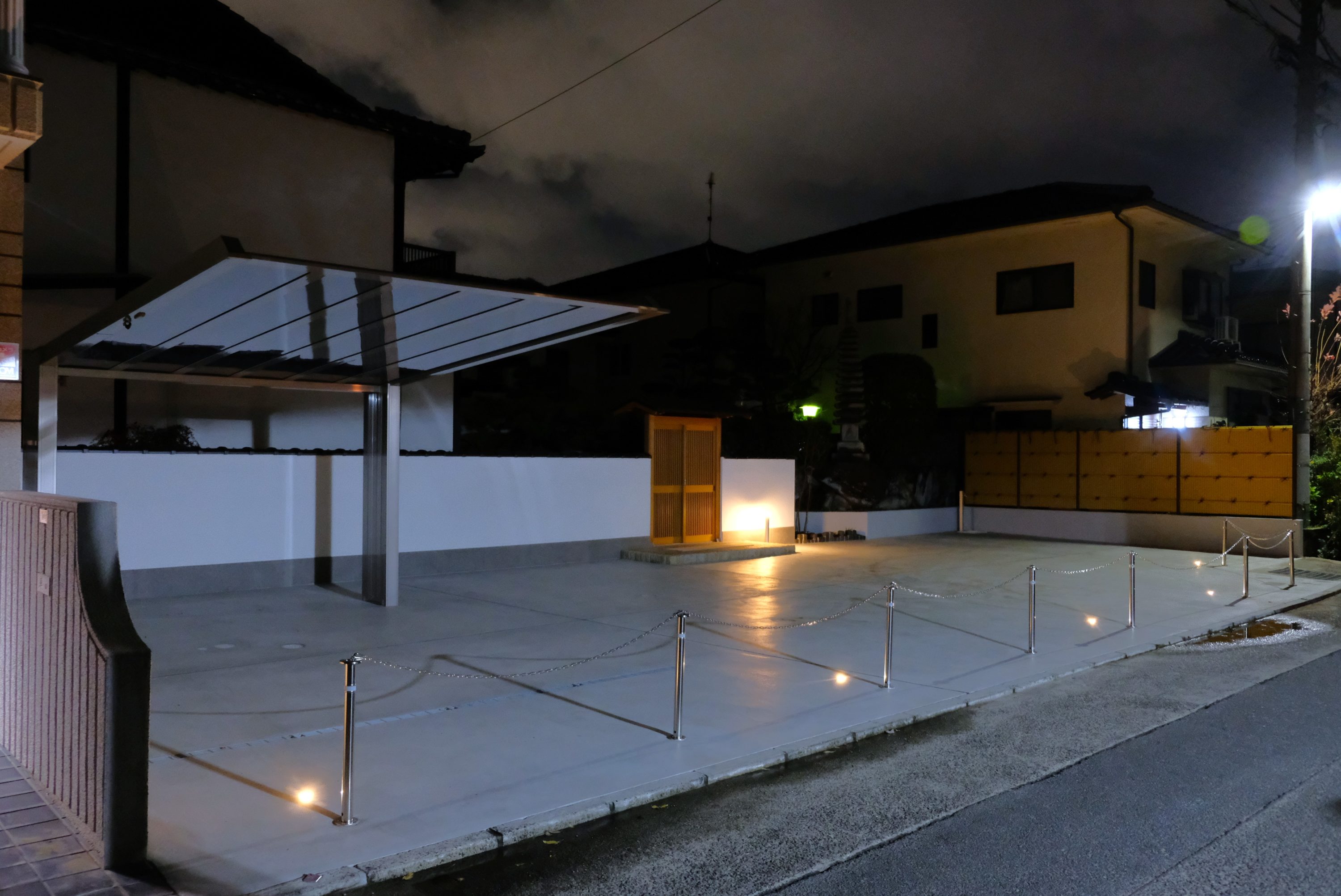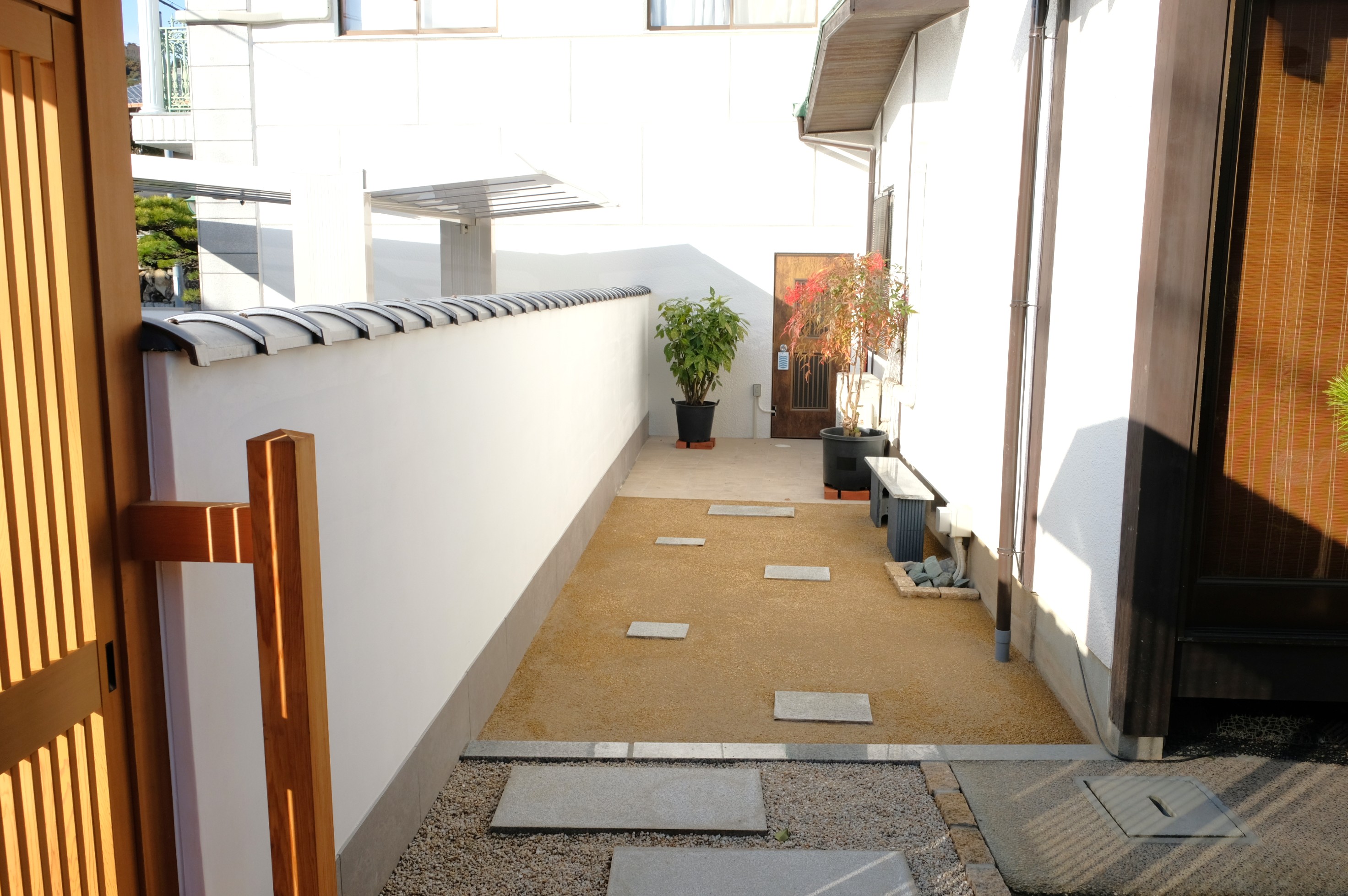 | 和風のお住まいに合わせ、機能性と意匠性を両立させた外構整備工事です。隣接地の駐車場化とともに、数寄屋門から広がる内庭の再整備を行いました。 和風建築の趣を損なうことなく、現代のライフスタイルに求められる機能性と防犯性の両立を目指し、住まいと一体感のある新たな和の空間をデザインしました。 1. 構造基盤と品質管理 カーポートは片支持を採用。構造上の強度を確保するため、鉄筋組みを施した大型コンクリート基礎を構築しています。 駐車場の舗装は、11月下旬の施工において、低温下でも規定の強度を確保できるよう、温度管理を徹底しました。 2. 敷地形状に合わせた意匠設計 整形地ではない条件下において、視覚的なバランスを整える設計を行いました。どの角度から見ても整然とした景観を維持できるよう配慮しました。 3. 素材の再利用と和風空間の創出 既存の素材を活かし、建物と調和する「和」の空間を構成しました。 数寄屋門を抜けた先の内庭には、撤去前のブロック積に使用されていた瓦を敷瓦として再利用し、新たな和の趣を持つ空間として再構築しました。 建仁寺垣、漆喰塀、敷瓦、植栽を組み合わせ、駐車場という人工的な中に自然な居心地の良い空間を実現しました。フットライト等の照明が夜間の空間を優しく照らします。 4. 機能性と防犯の両立 施主様のご要望に合わせ、駐車場内で洗車ができるよう、景観を損なわない配置で汚水・雨水配管および立水栓を整備。適切な排水処理を確保しています。 また、敷地入り口にチェーンポールを設置し、物理的な防犯性を高めました。 | |