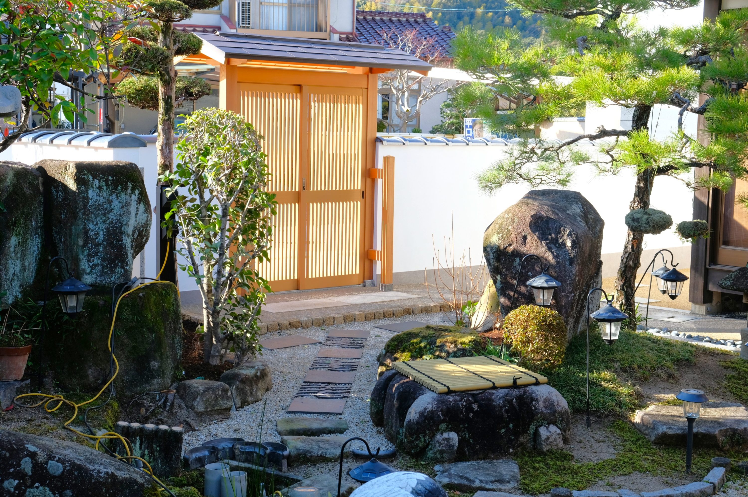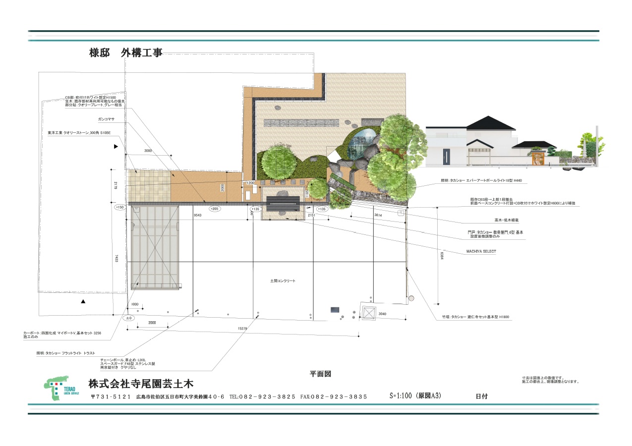 | 施工概要 | カーポート: 片支持カーポート 和装・内庭: 数寄屋門、建仁寺垣、漆喰塀、敷瓦(再利用)、植栽、ガーデンライト 舗装: 土間コンクリート、タイル貼り、自然土防草舗装 設備: 立水栓、排水・給水設備、車止めポール 等 施工期間:約2カ月 |